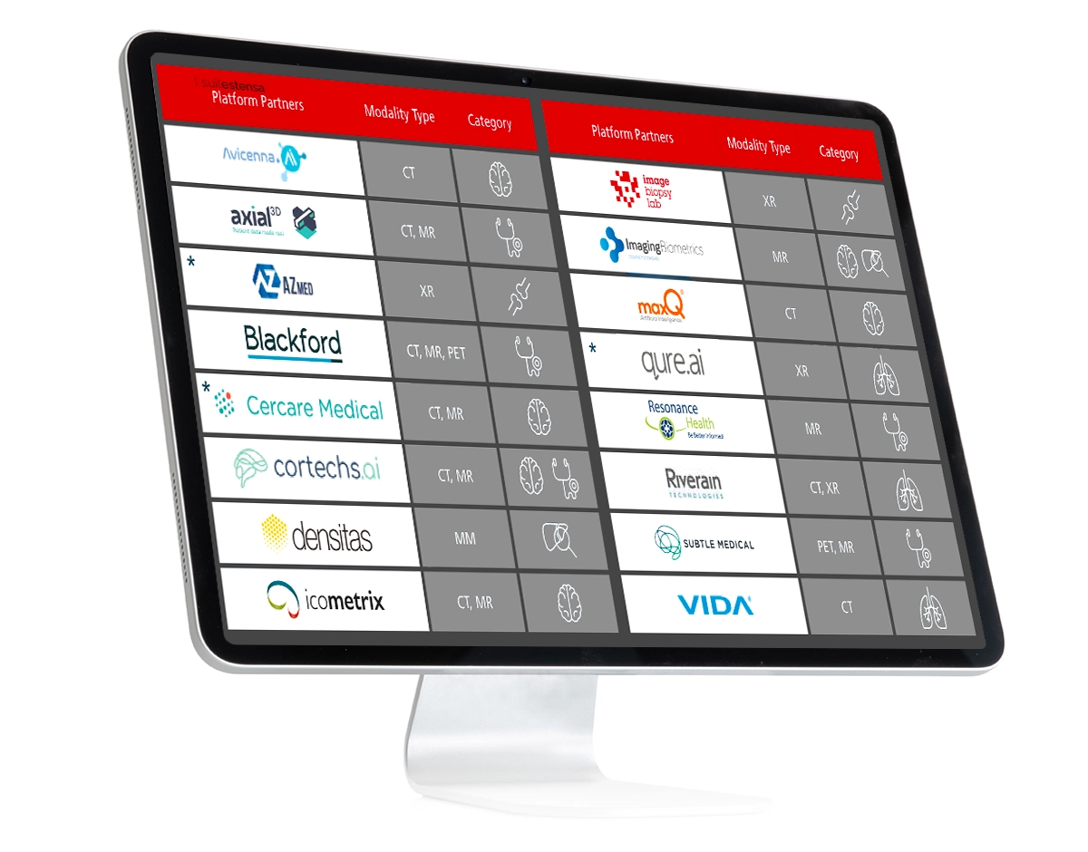 Suitestensa fAInd is a multi-platform, AI-powered solution designed to streamline the discovery, integration, and clinical use of artificial intelligence applications across medical imaging. By reducing time-to-market and simplifying interoperability with RIS-PACS systems, the platform enables healthcare professionals to easily adopt AI into their daily workflow, enhancing diagnostic precision and clinical efficiency.