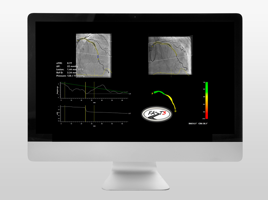 CAAS vFFR (Pie Medical Imaging, Maastricht, Holanda) é um conjunto de software FFR baseado em angio para permitir a avaliação fisiológica da estenose coronária intermediária sem a necessidade de um fio de pressão e adenosina. O valor vFFR pode ser calculado apenas com duas projeções angiográficas e a pressão da raiz aórtica. Este vFFR tem uma alta correlação e precisão de diagnóstico em comparação com medições invasivas de FFR e NHPR baseadas em fios e os resultados de vFFR são comprovadamente altamente reprodutíveis.